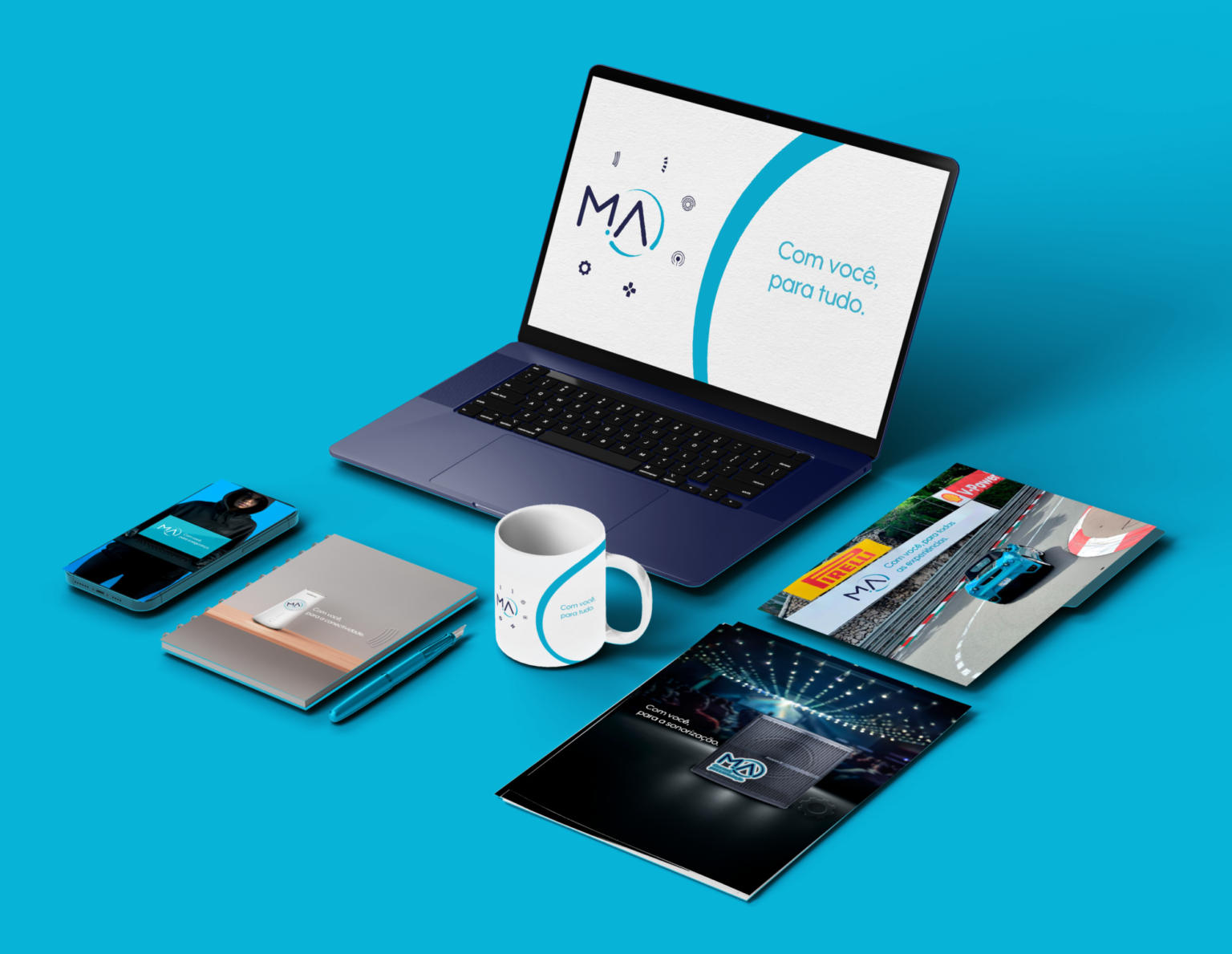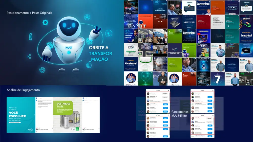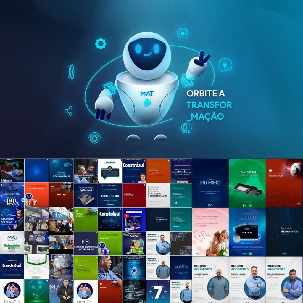 A comunicação da marca foi estruturada em diferentes editorias de conteúdo, permitindo abordar tecnologia, produtos, eventos e parcerias de forma consistente e alinhada ao novo posicionamento da M.A. Buscando fugir de um padrão do mercado, usamos a cor azul clara, para diferenciação, enquanto que texturas, ornamentos e fontes se encotnram em semelhança ao logotipo da empresa