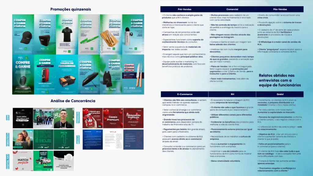 Para compreender o cenário da marca, analisamos a comunicação atual da empresa, o posicionamento dos concorrentes e os diferenciais internos da M.A.