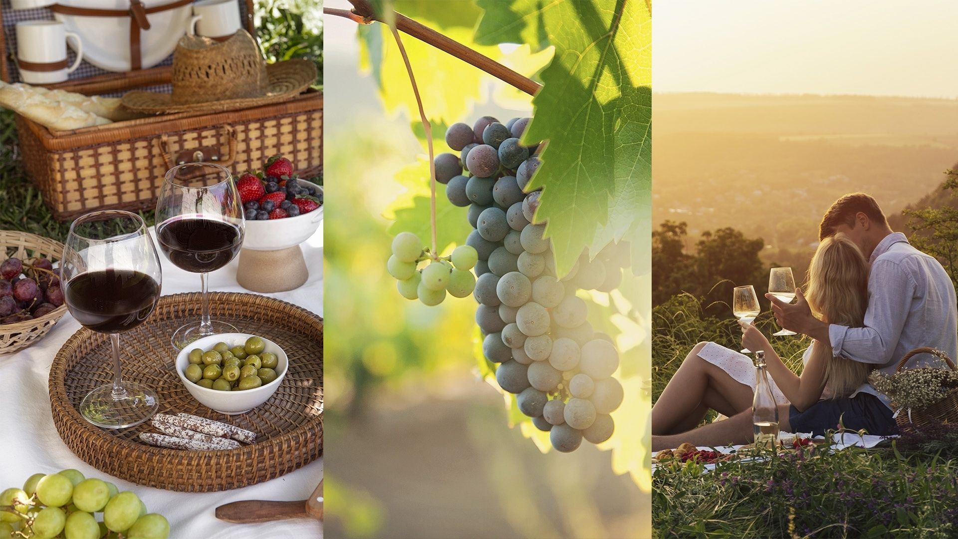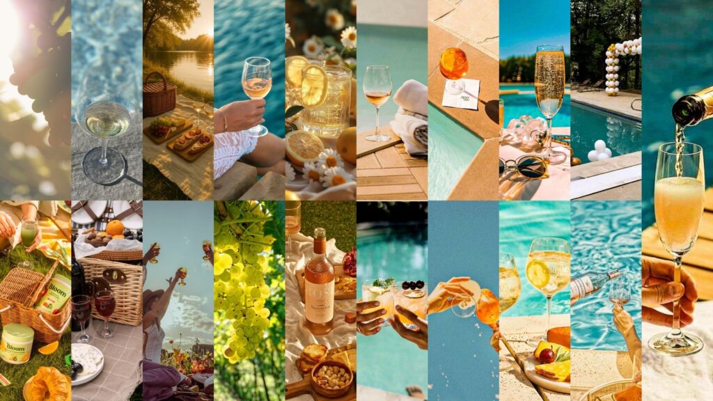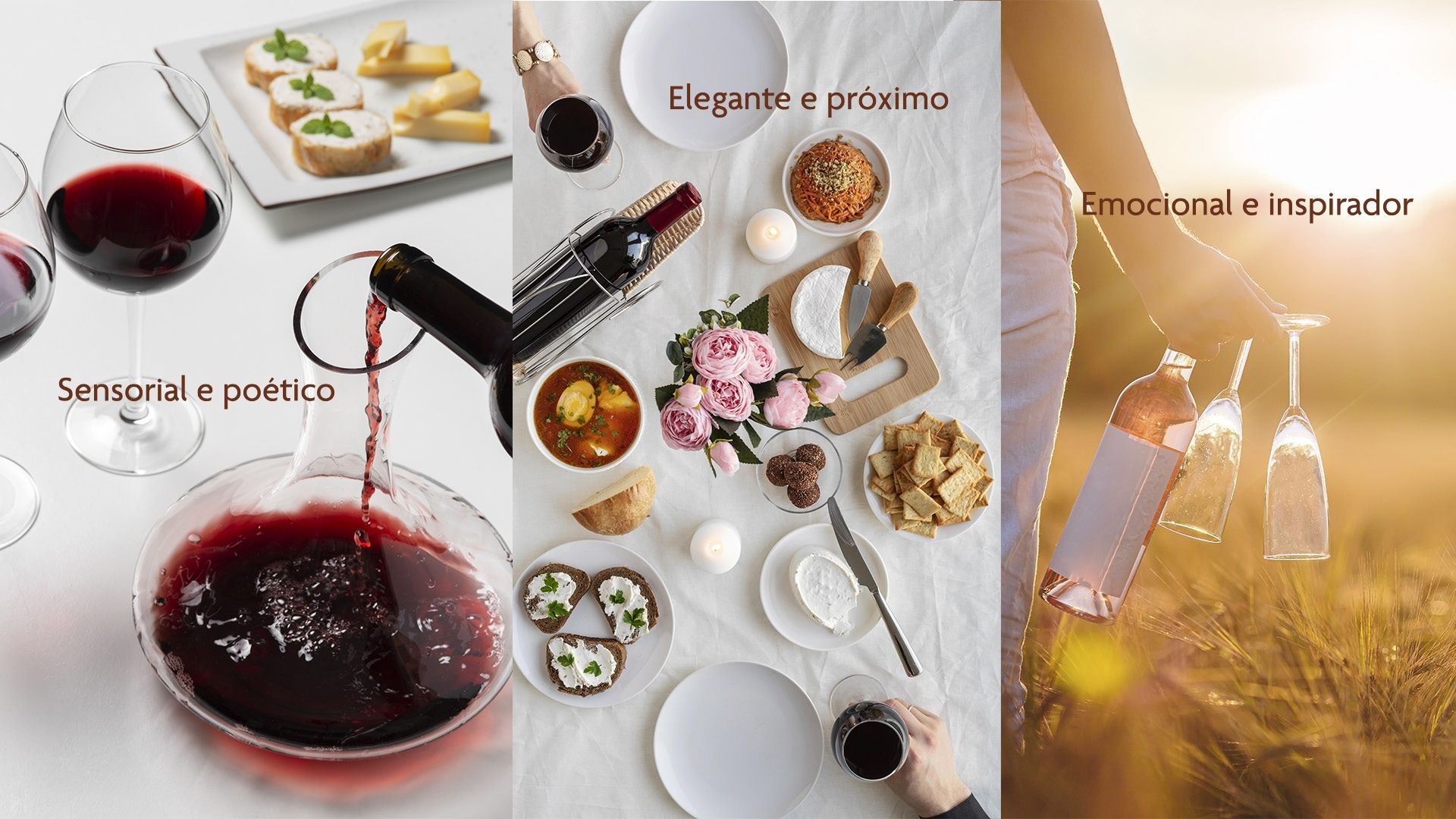 As imagens valorizam momentos espontâneos de celebração, integrando vinho, natureza e convivência. A paleta de cores naturais, combinada com luz suave e composições abertas, contribui para transmitir uma atmosfera de relaxamento, autenticidade e prazer.