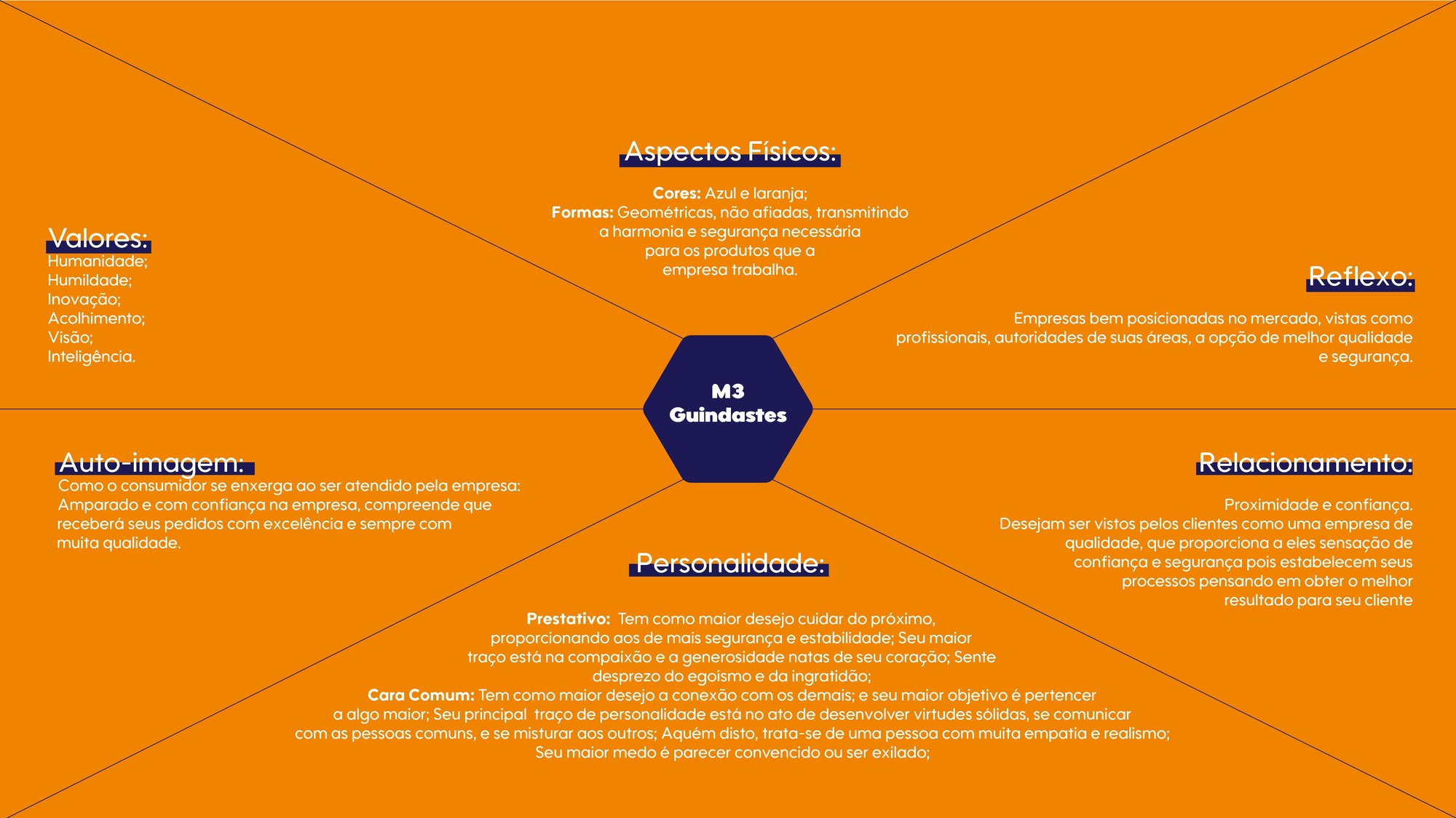 Para estruturar a identidade da M3 Guindastes, utilizei o Prisma de Identidade de Marca como ferramenta para organizar e compreender os diferentes aspectos que compõem a percepção da empresa.